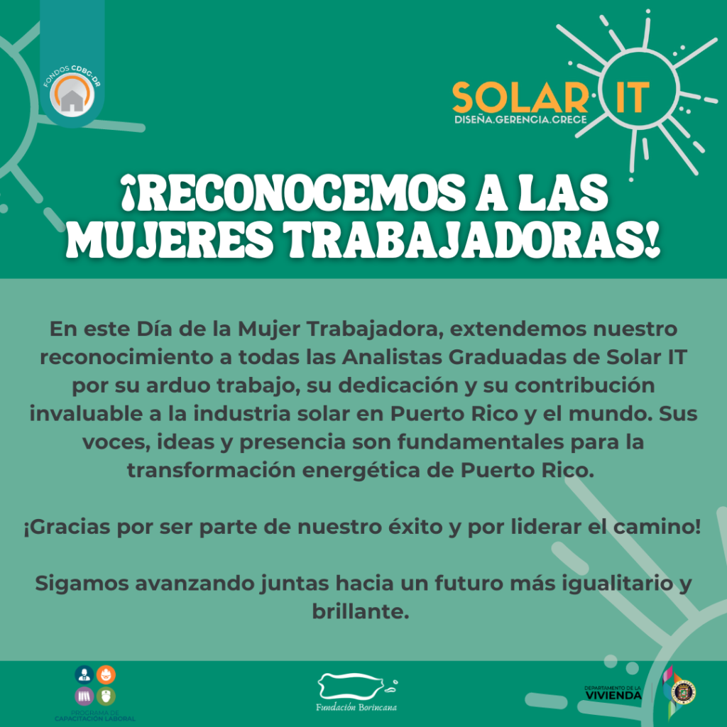 En este Día de la Mujer Trabajadora, extendemos nuestro reconocimiento a todas las Analistas Graduadas de Solar IT por su arduo trabajo, su dedicación y su contribución invaluable a la industria solar en Puerto Rico y el mundo. Sus voces, ideas y presencia son fundamentales para la transformación energética de Puerto Rico.